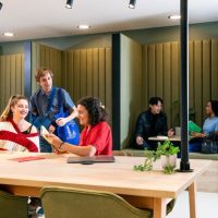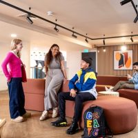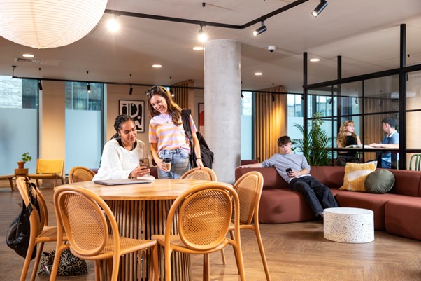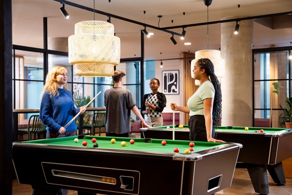 The ground floor has a newly refurbished common room with two sofa areas, a TV, pool tables and table football. There is a separate study space, a private outdoor courtyard with picnic tables, deckchairs and ping pong.